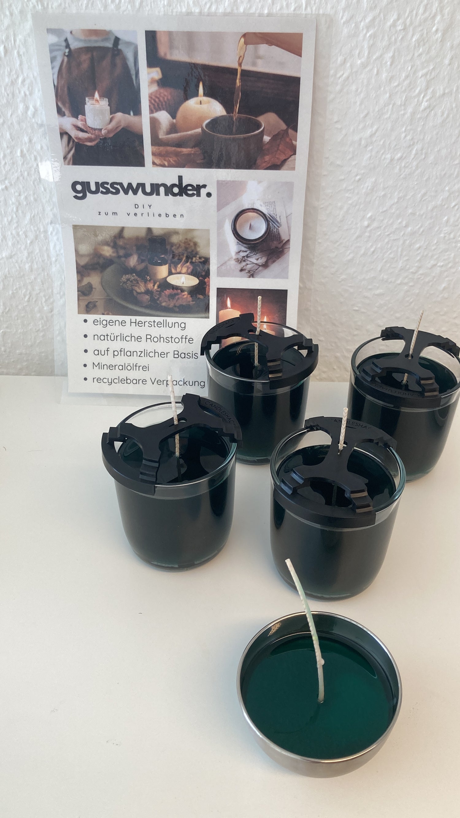 So habe ich angefangen zu überlegen, was man für eine Kerze im Glas braucht. Nach Anschaffung einer kleinen Grundausstattung und den ersten Versuchen in der heimischen Küche hatte ich bereits eine handvolle Auswahl an Duftkerzen auf dem Tisch stehen.