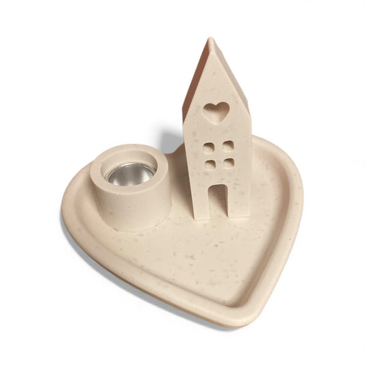 handgegossener Herz-Kerzenhalter aus Jesin mit Häuschenmotiv