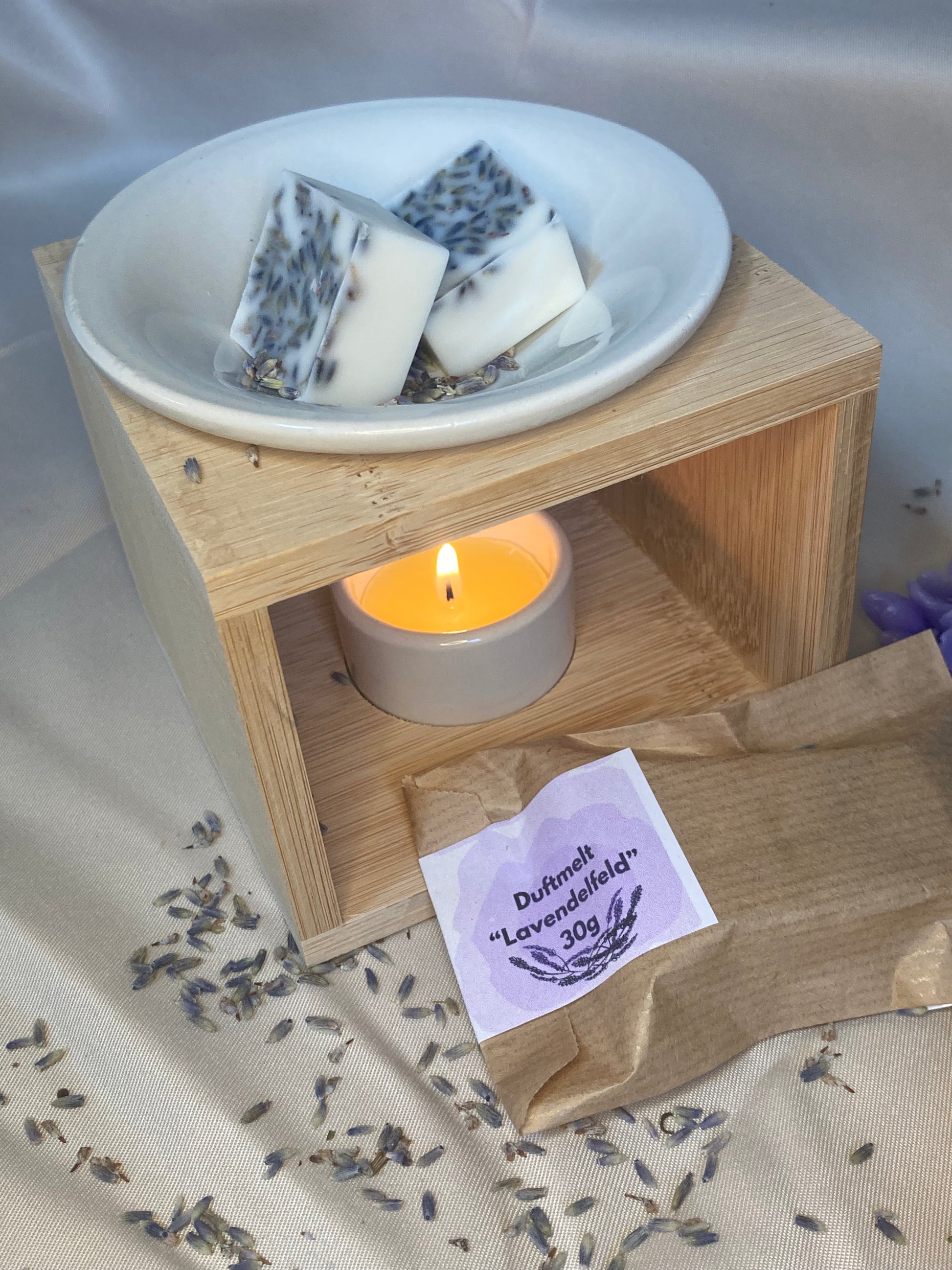 Die Duftmelts werden zusätzlich mit getrockneten Lavendelblüten in Bio-Qualität dekoriert.